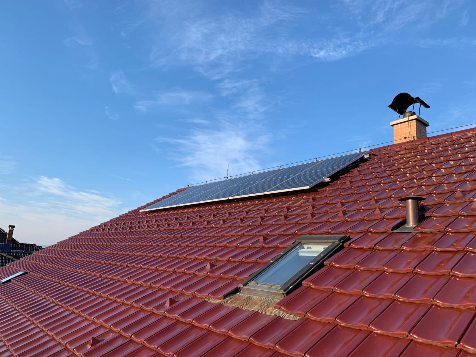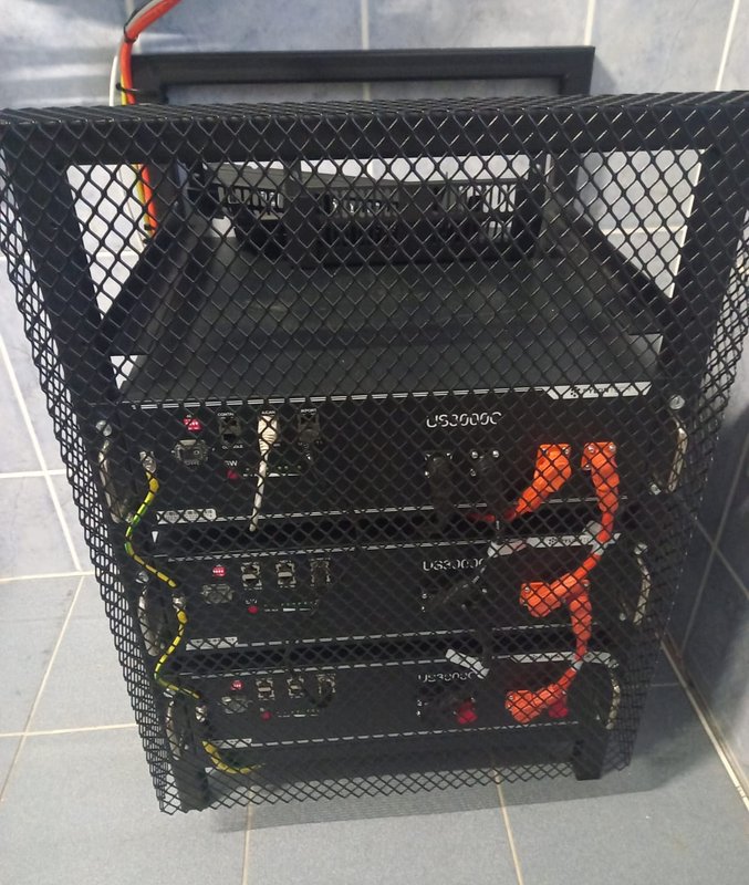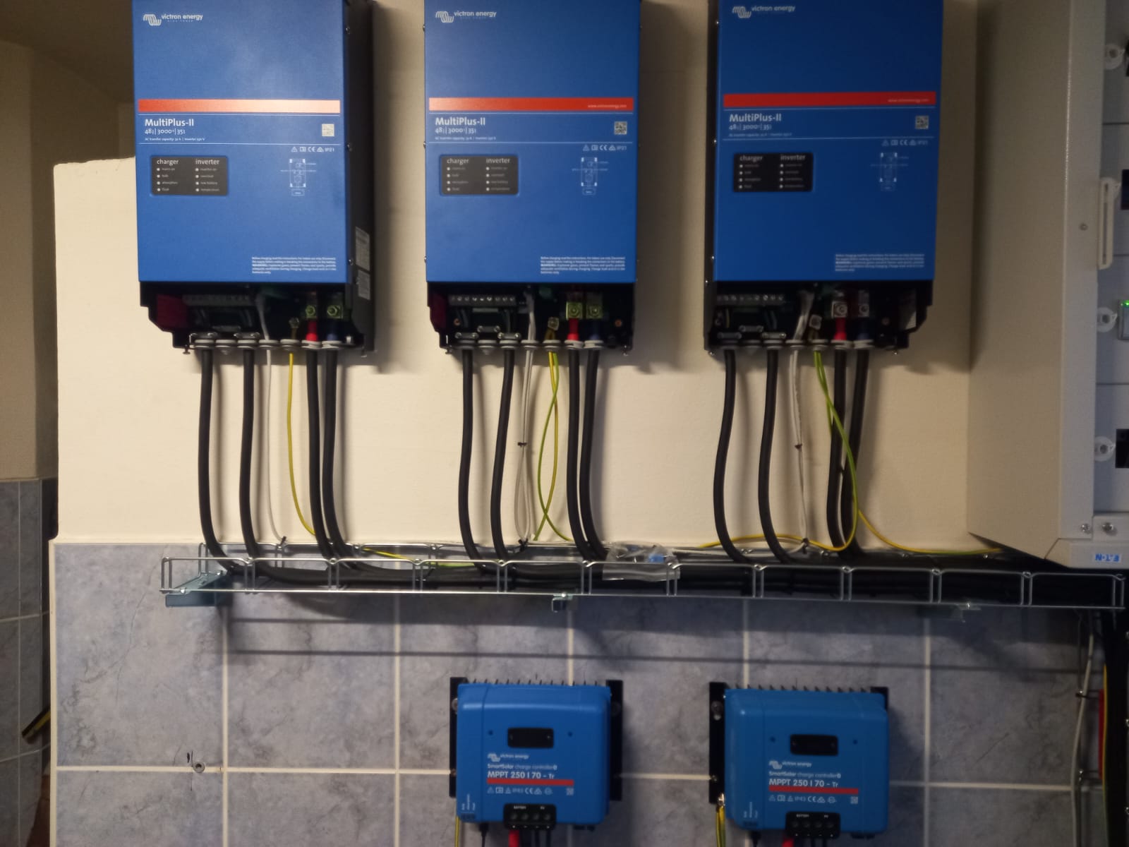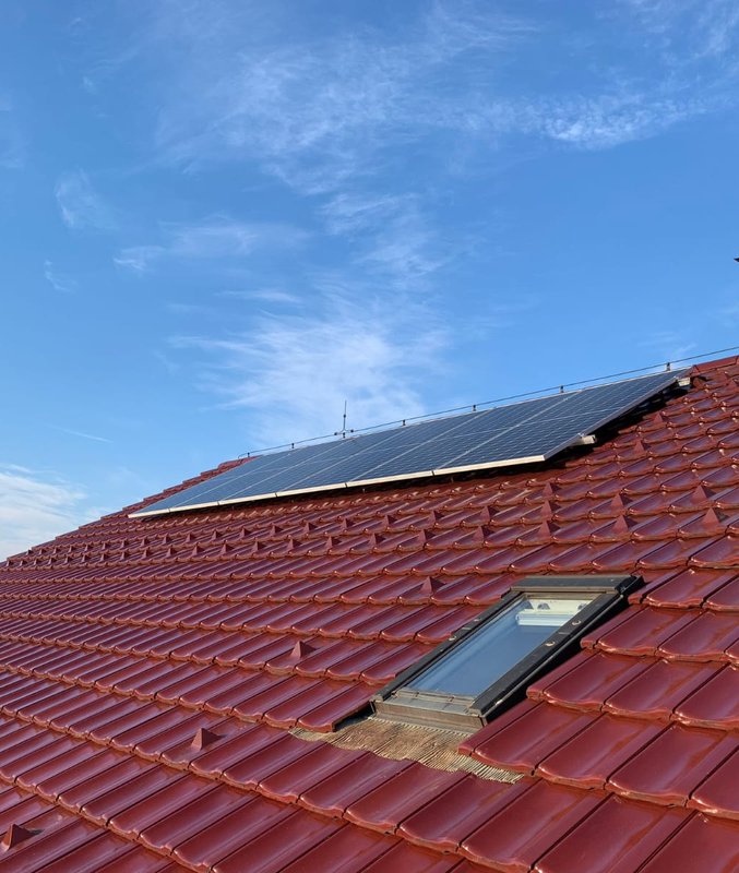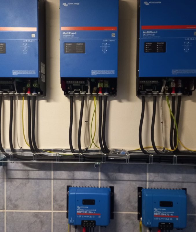 Instalace fotovoltaické elektrárny o výkonu 5,4 kWp v Hroznové Lhotě: 12 ks panelů Longi 450 Wp, 3ks střídače Victron multiplus II 48V 3000VA 35-32A, 3 ks baterie Pylontech US3000.