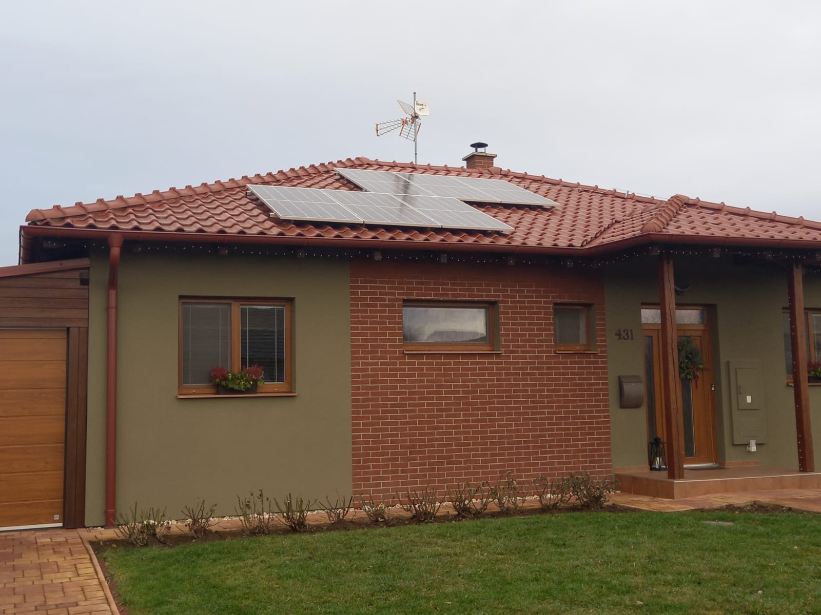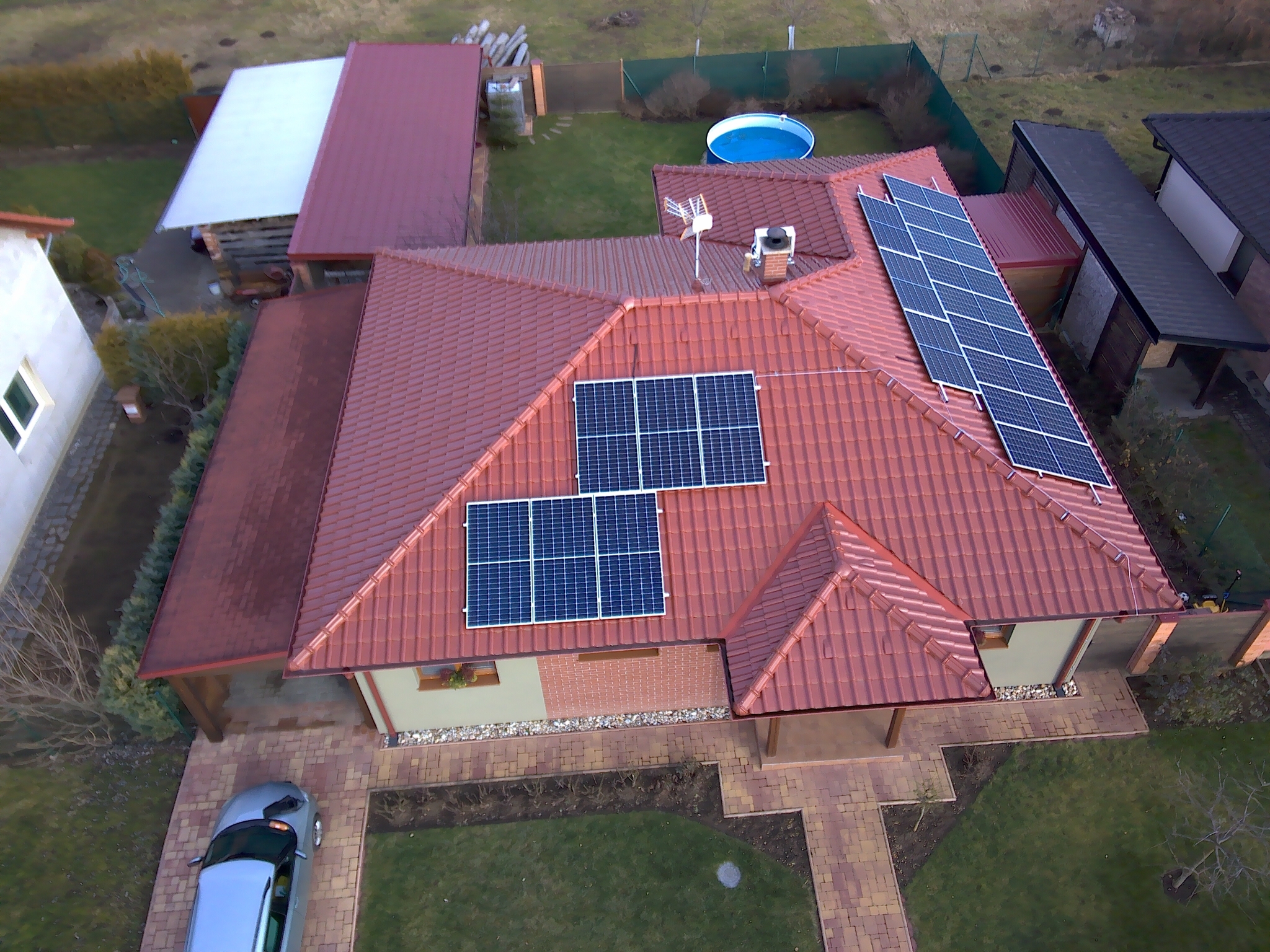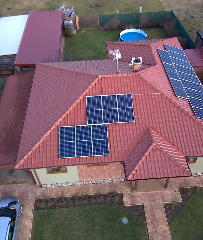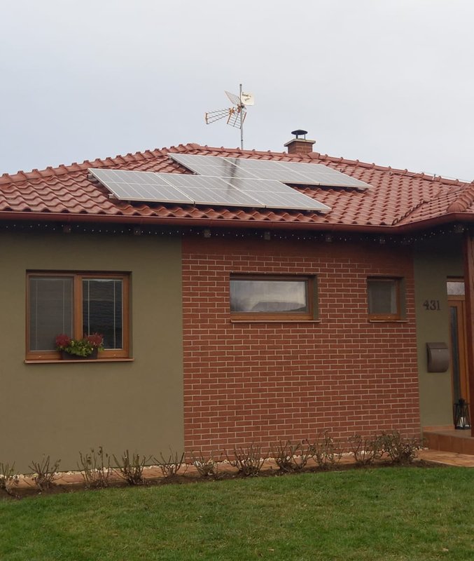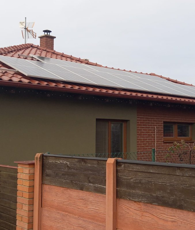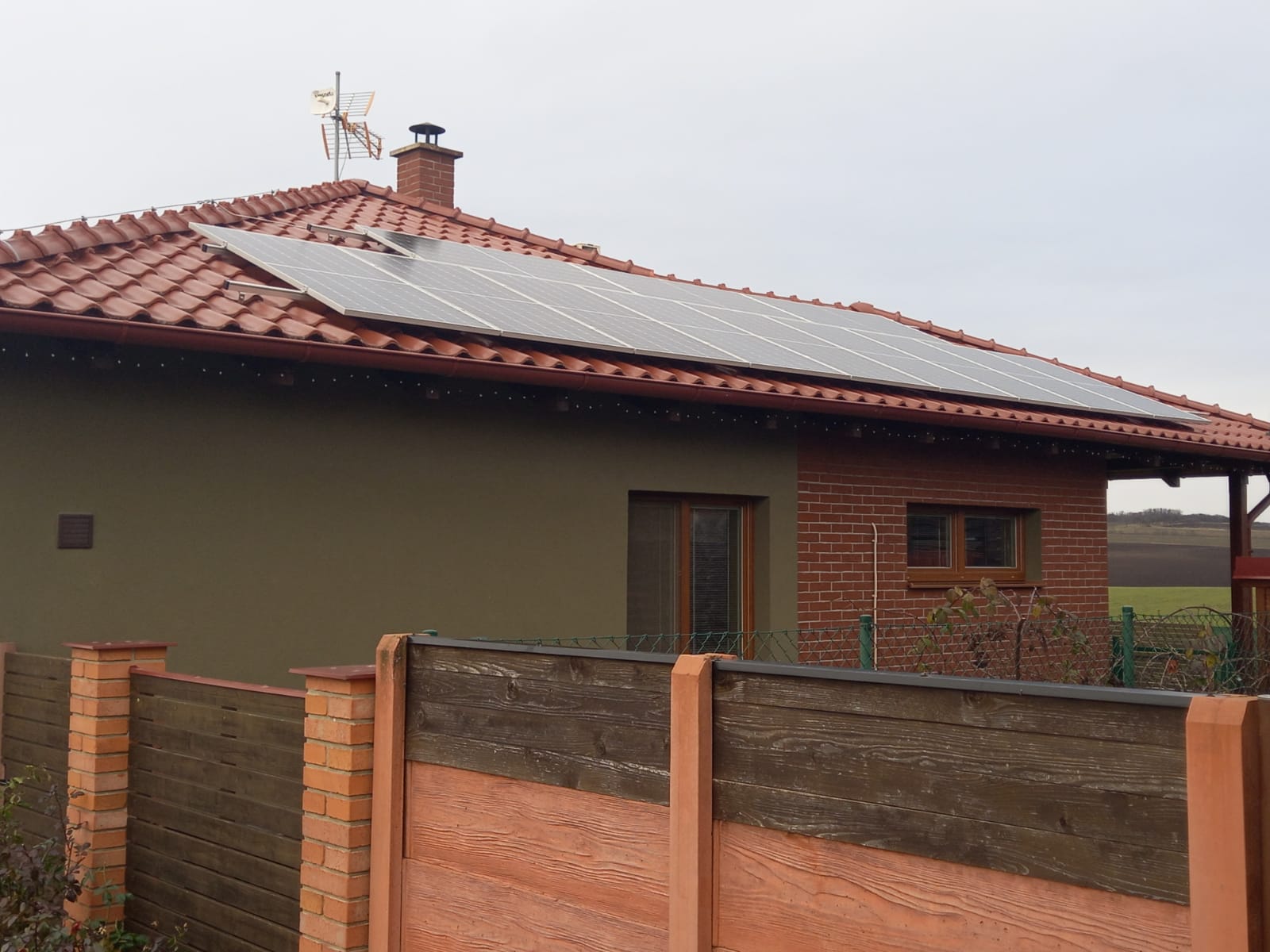 Instalace fotovoltaické elektrárny o výkonu 8,1 kWp v Hroznové Lhotě: 18 ks panelů Risen solar 450 Wp, 3ks střídače Victron multiplus II 48V 3000VA 35-32A, 3 ks baterie Pylontech US5000.